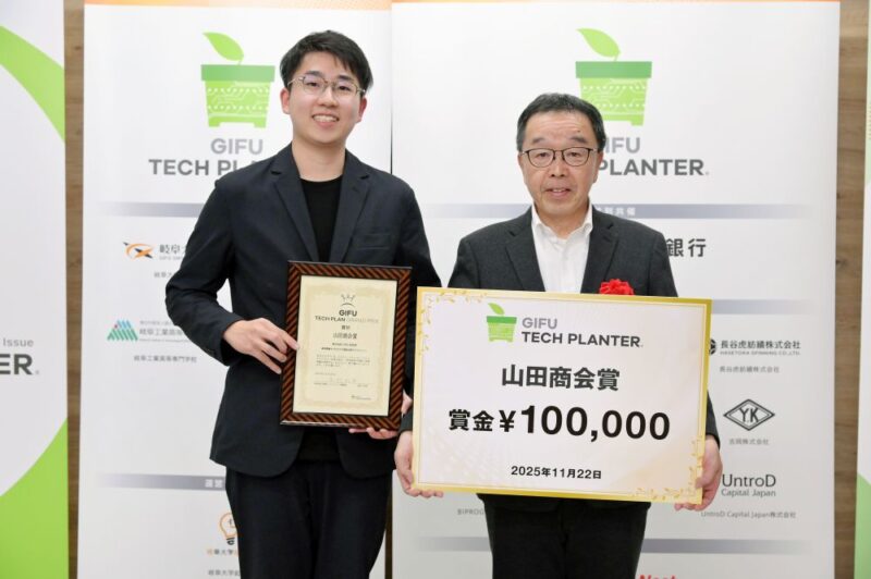 株式会社山田商会ホールディング(本社:愛知県名古屋市、代表取締役:山田豊久)の子会社である株式会社山田商会は、2025年11月22日(土)にOKB SCLAMB(OKB岐阜大学プラザ2F 岐阜大学内)にて開催された「第5回岐阜テックプラングランプリ」(主催:株式会社リバネス)において、土砂災害評価技術と研究成果を基盤に、地理情報データの分析スキルを活かし森林整備・災害リスク・炭素吸収量を専門的に評価し、森林整備の負担を可能な限り減らすようなソリューションを提供することで、持続可能な森林づくりへの貢献を目指している株式会社OWL研究所に山田商会賞を授与しました。